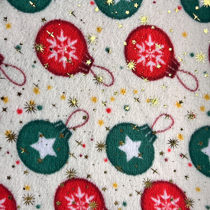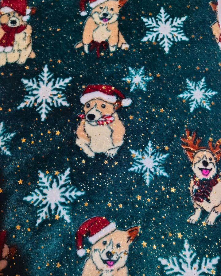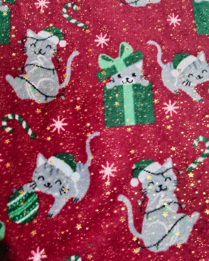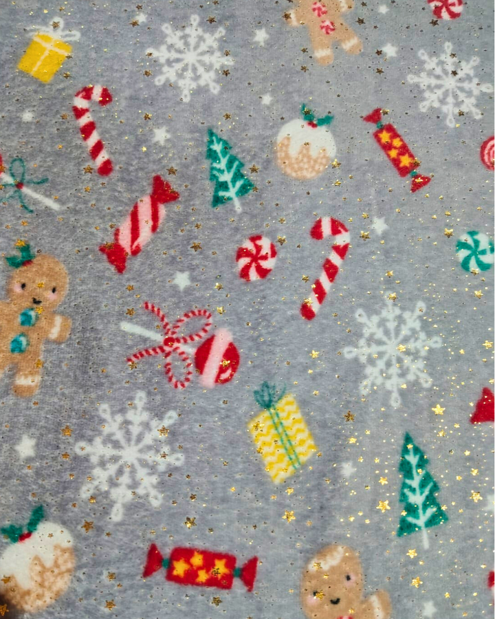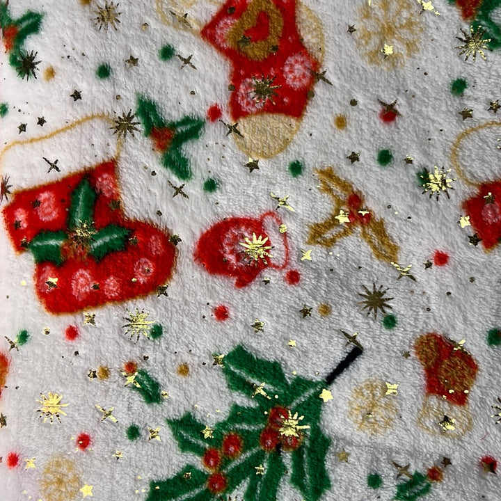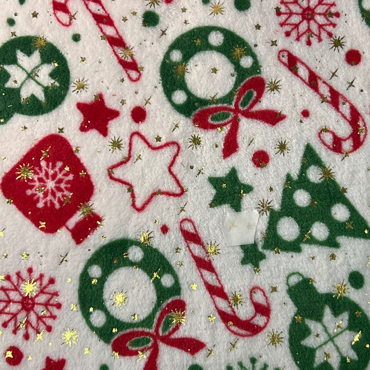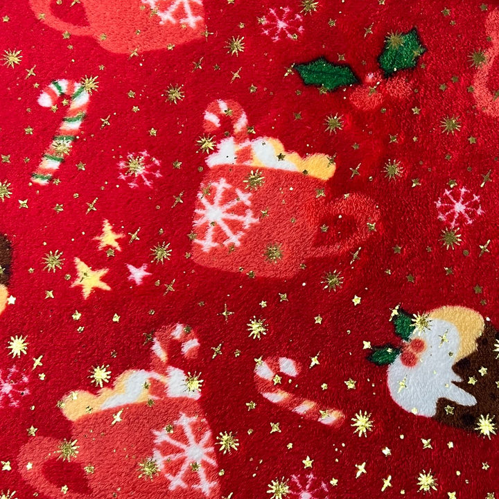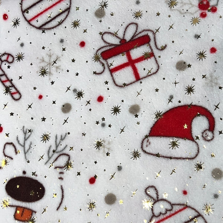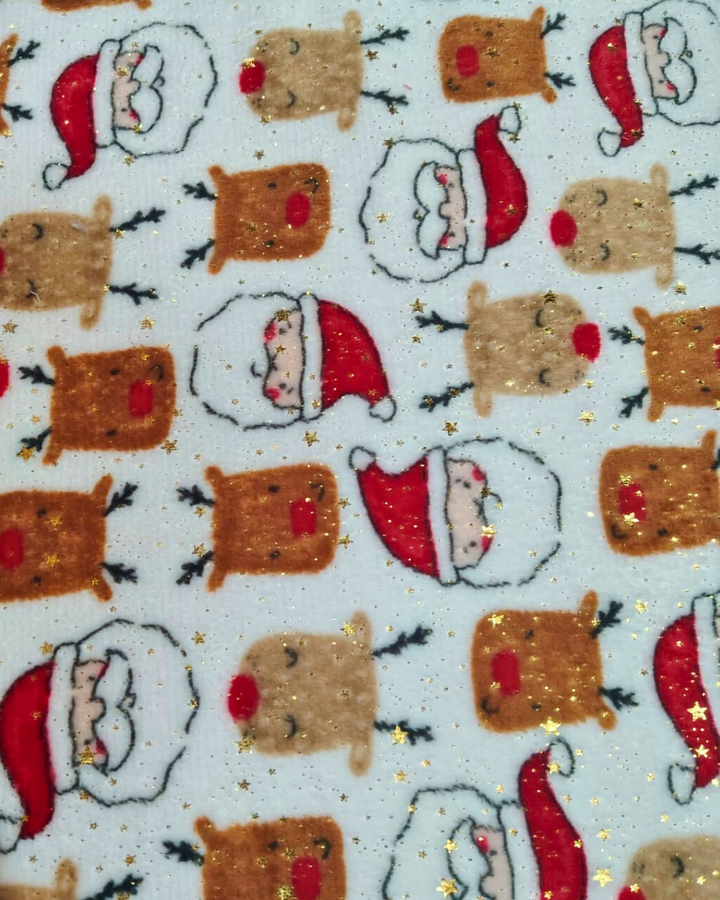 Es un textil felpa doble cara tipo Flannel Fleece, con un ancho de 1.60 mts y un gramaje de 191.97 g/m². Su tejido de punto por urdimbre, con pelo suave en ambas caras y acabado estampado, ofrece textura cálida, suave y decorativa, perfecta para proyectos que requieren confort y un aspecto festivo.