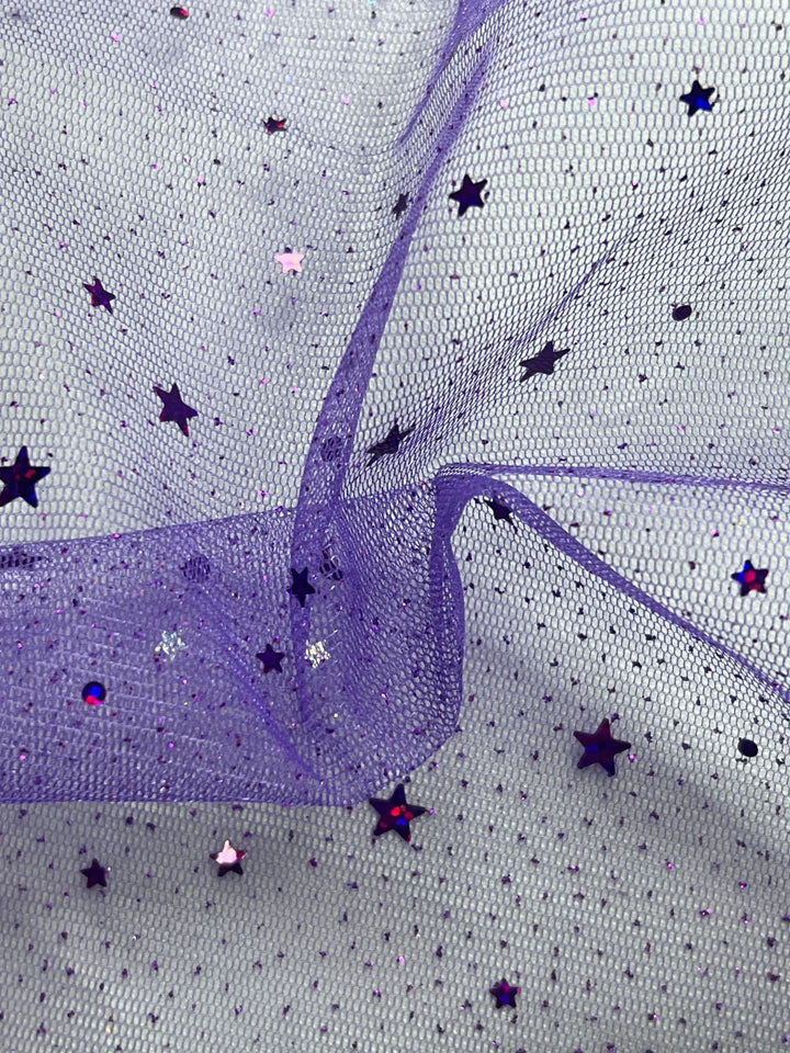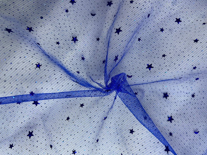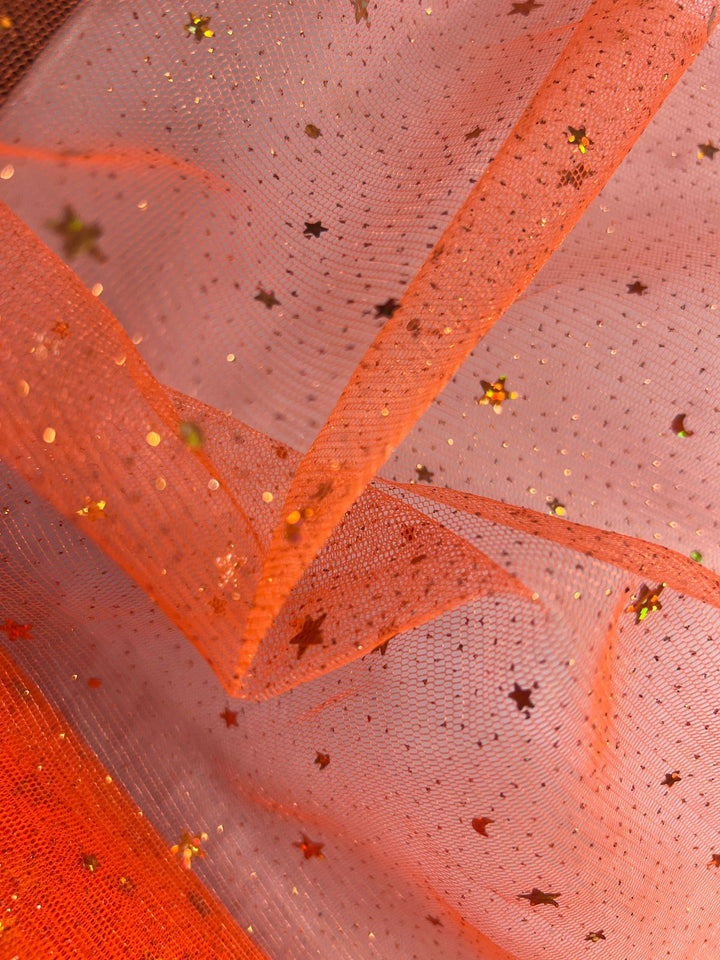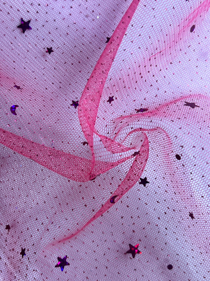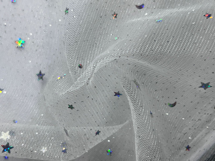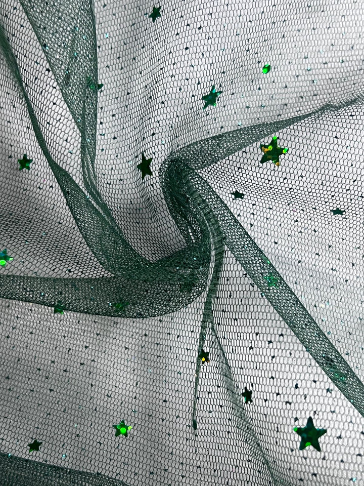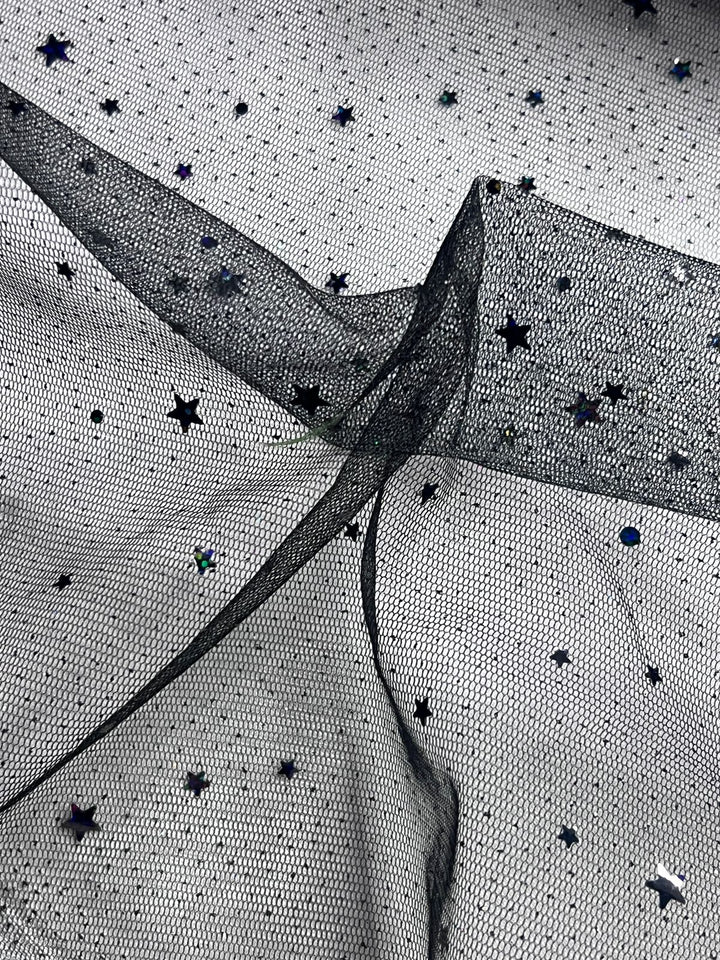 El Tull Escarchado Estrella es un tejido de punto extra liviano, elaborado en 100% poliéster monofilamentos. Su construcción en urdimbre imita el tull clásico, con acabado de estampado en partículas hexagonales de escarcha y estrellas, lo que le da un efecto brillante y elegante.